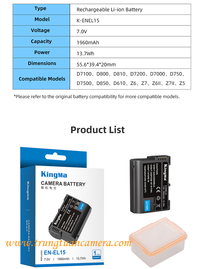 Pin máy ảnh Kingma for Nikon EN-EL15 dung lượng 1960mAh có sẵn hàng tại Trung Tuấn Camera - Mobile/Zalo: 0983009761.