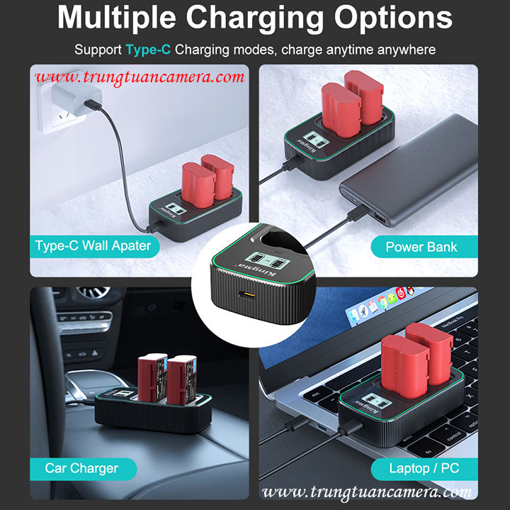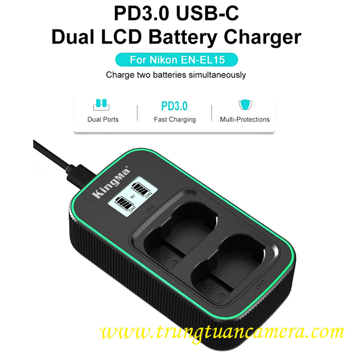 Sạc được 1 hoặc 2 pin cùng lúc. Sạc được tất cả các loại pin EL15 của Nikon và các hãng thứ 3 khác chứ không chỉ riêng pin hãng Kingma.