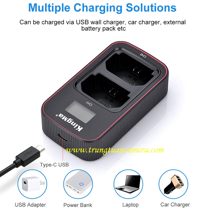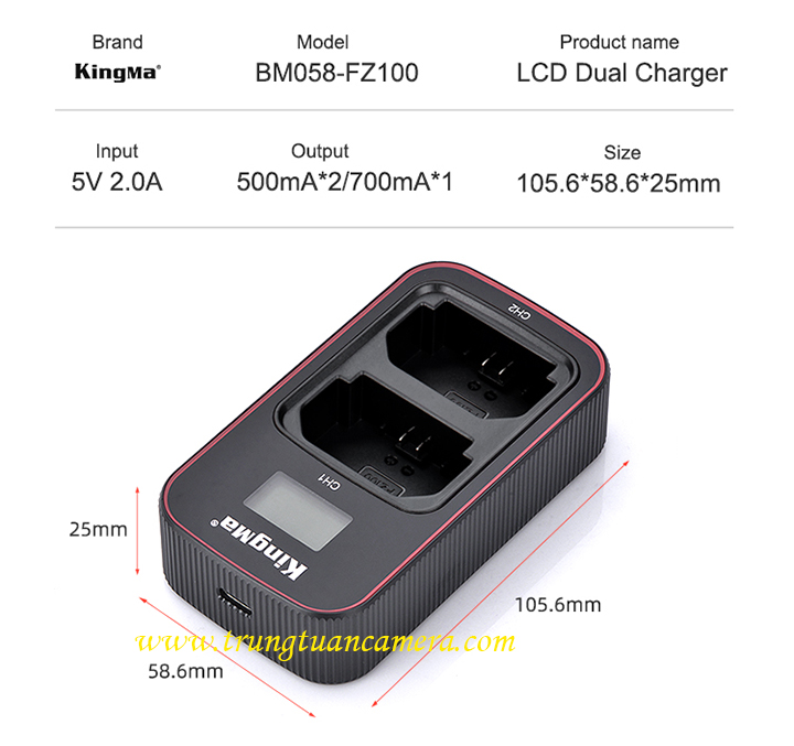 Sạc đôi, sạc nhanh BM058 Kingma for Sony FZ100 đầu vào 5V 2A: Sạc nhanh Kingma BM058, sạc đầy 1 hoặc 2 pin cùng lúc, có màn hình LCD hiển thị dung lượng pin đang sạc. Tặng kèm cáp sạc Type C.