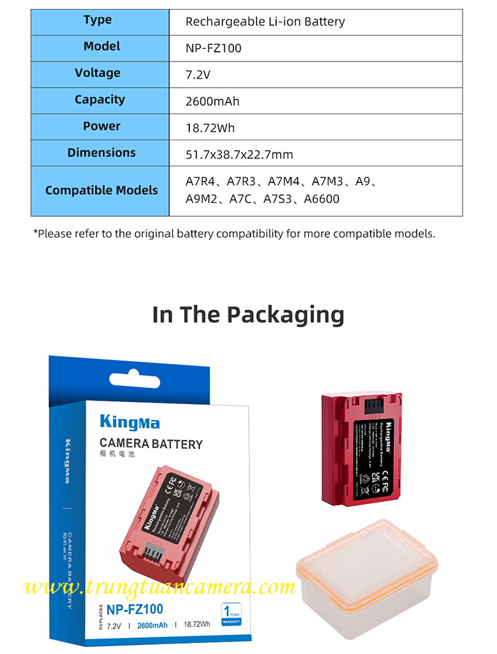 Pin máy ảnh Kingma cho Sony FZ100 màu đỏ dung lượng 2600mAh: giá 530.000 vnđ