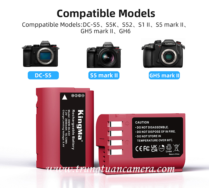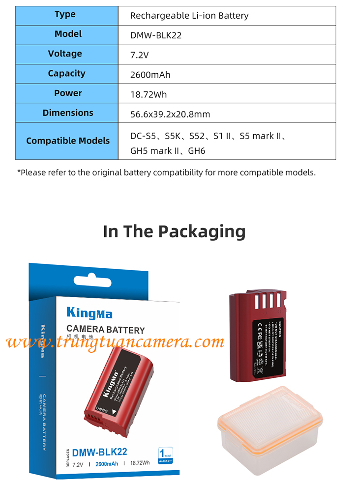 KingMa 2600mAh DMW-BLK22 Camera Battery for Panasonic Lumix S5M2 / S5M2X / S5 / S9 / GH7 / GH6 / GH5M2 / GH5S / GH5 / G9M2 / G9 Camera - Trung Tuấn Camera - Mobile/Zalo: 0983009761.