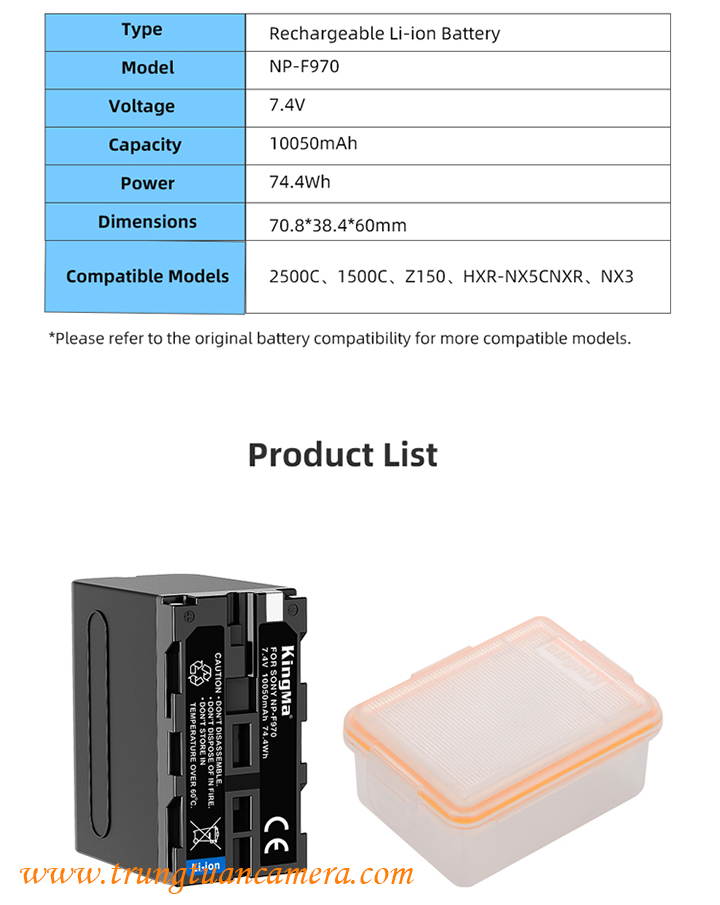 Pin máy quay Kingma for Sony F970 dung lượng cao 10050mAh có khả năng tương thích cao, dùng thay thế được cho các pin sau của Sony: