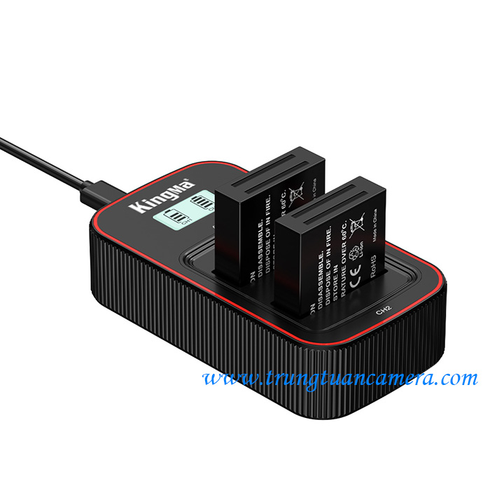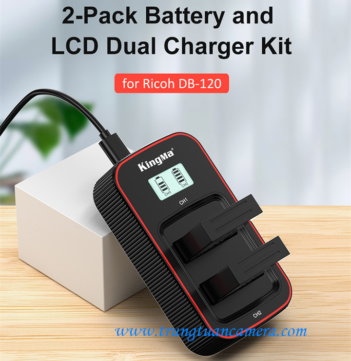 Sạc đôi, sạc nhanh Kingma BM058 cho RICOH DB-120: đầu vào 5V 2A: Sạc nhanh Kingma BM058 (sạc viền đỏ), sạc đầy 1 hoặc 2 pin cùng lúc, có màn hình LCD hiển thị dung lượng pin đang sạc. Tặng kèm cáp sạc Type C.
