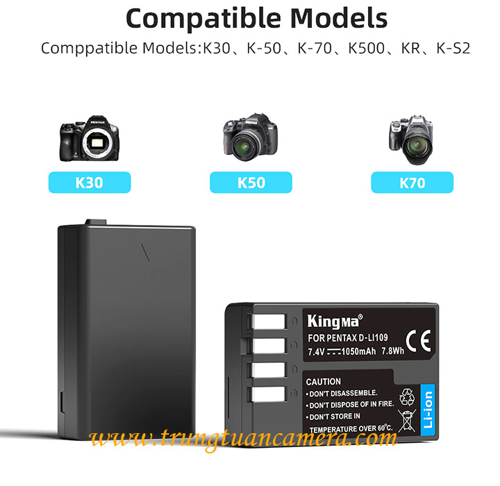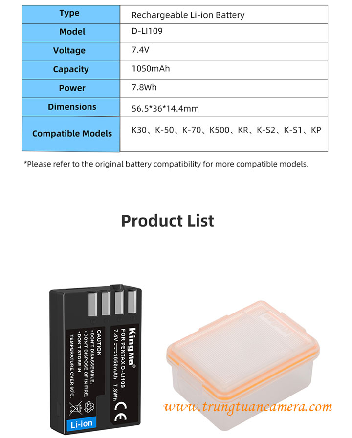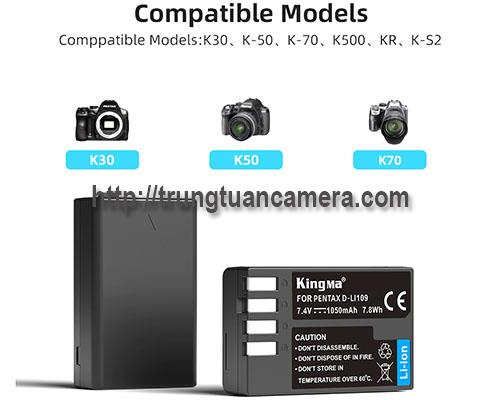 Kingma Battery for Pentax D-LI109 - Pin máy ảnh Kingma for Pentax D-LI109 dung lượng 1050mAh - Trung Tuấn Camera - Mobile/Zalo: 0983009761.