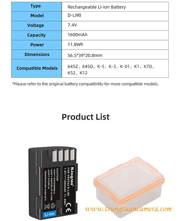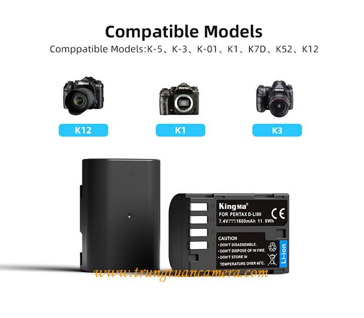 Kingma Battery for Pentax D-LI90 - Pin máy ảnh Kingma for Pentax D-LI90 dung lượng 1600mAh - Trung Tuấn Camera - Mobile/Zalo: 0983009761.