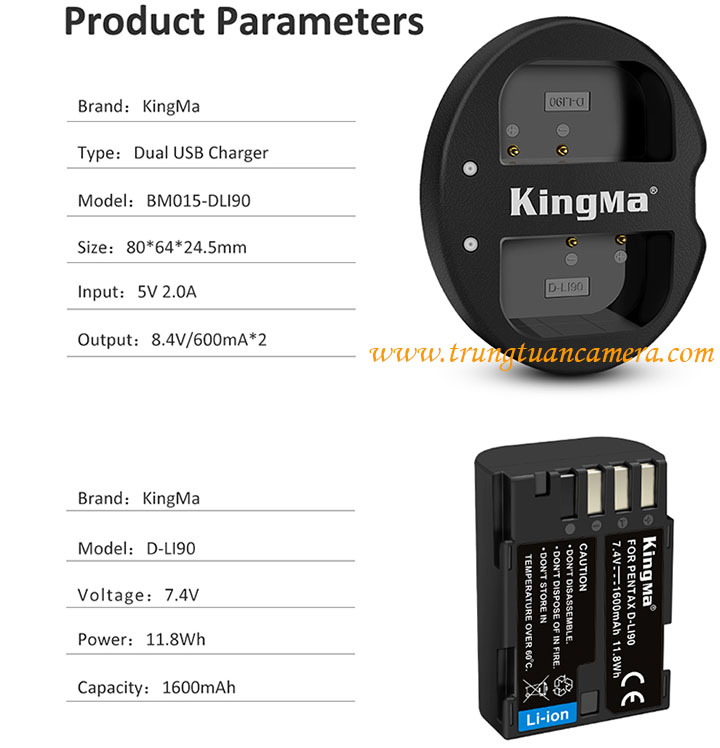 Cả bộ 2 pin Kingma for Pentax D-Li90 dung lượng 1600mAh + 1 sạc đôi Kingma cho Pentax D-Li90 (đã kèm cáp sạc): giá 730.000 vnđ
