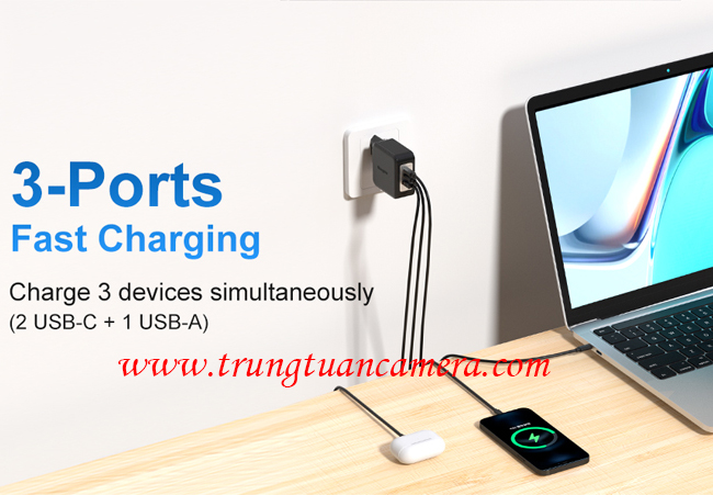 Củ sạc nhanh đa năng công suất lớn KingMa GaN Power Charger 100W Fast Charging Adapter PD3.1 PD100W: có 3 cổng kết nối: USB-A và 2 cổng USB-C