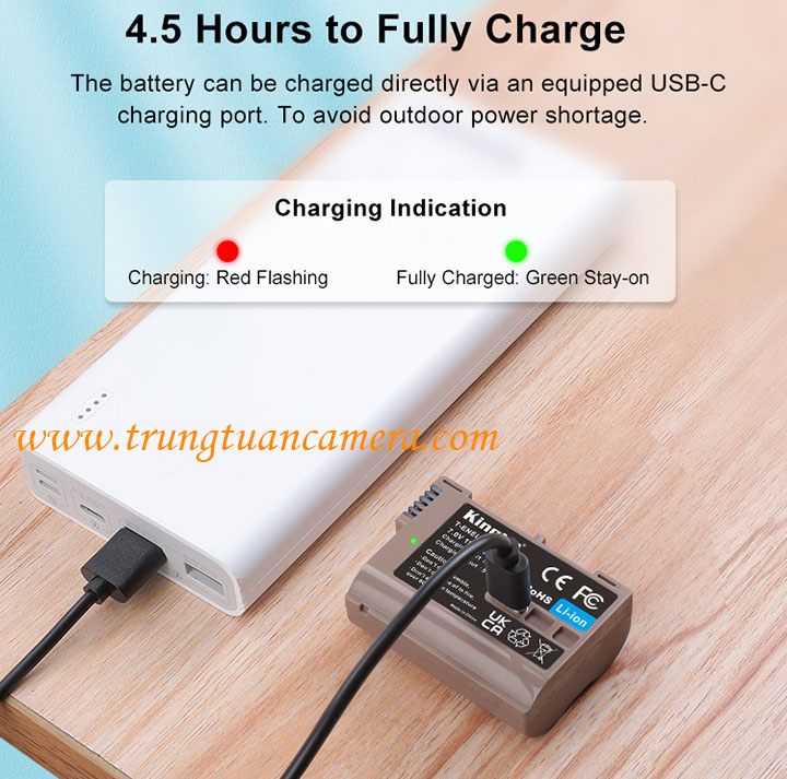 Tích hợp đầu sạc trực tiếp qua cổng Type-C trên pin, sạc mọi lúc mọi nơi mà không cần bộ sạc ngoài. Có thể sạc trực tiếp từ nguồn điện hoặc bộ lưu điện, sử dụng đầu vào 5V 2A Type-C để sạc trực tiếp pin Kingma for Nikon EL15.