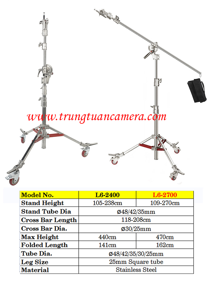 CHÂN BOOM LIGHT STAND L6-2400 QIHE Thiết kế tinh tế kết hợp vật liệu thép không gỉ đảm bảo làm việc trong môi trường khắc nhiệt không bị ăn mòn, CHÂN BOOM LIGHT STAND L6-2400 QIHE Khả năng làm việc chắc chắn với độ cao 4,4m. Với chân C sải rộng ống thanh trụ lớn tạo cho chân hoạt động hoàn hảo cùng bộ 3 bánh xe cho phép nhiếp ảnh gia điệu chỉnh ánh sáng dễ dàng.